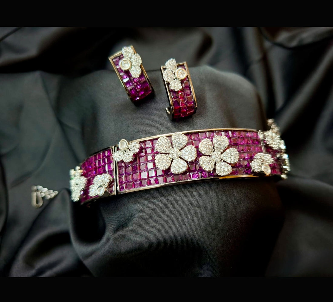 Crystal Choker Set w 3D Flowers, Nano Setting Cubic Zirconia