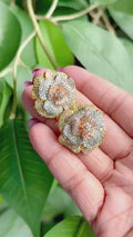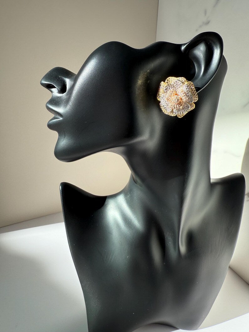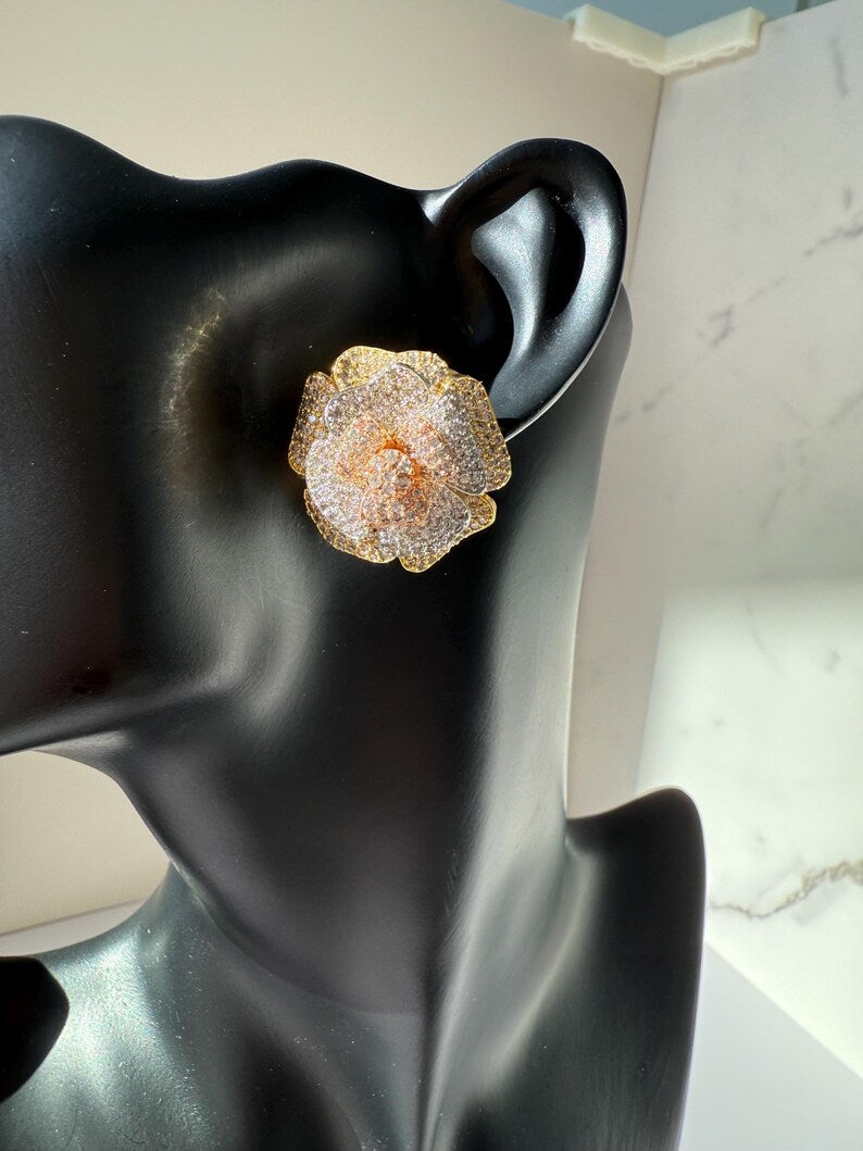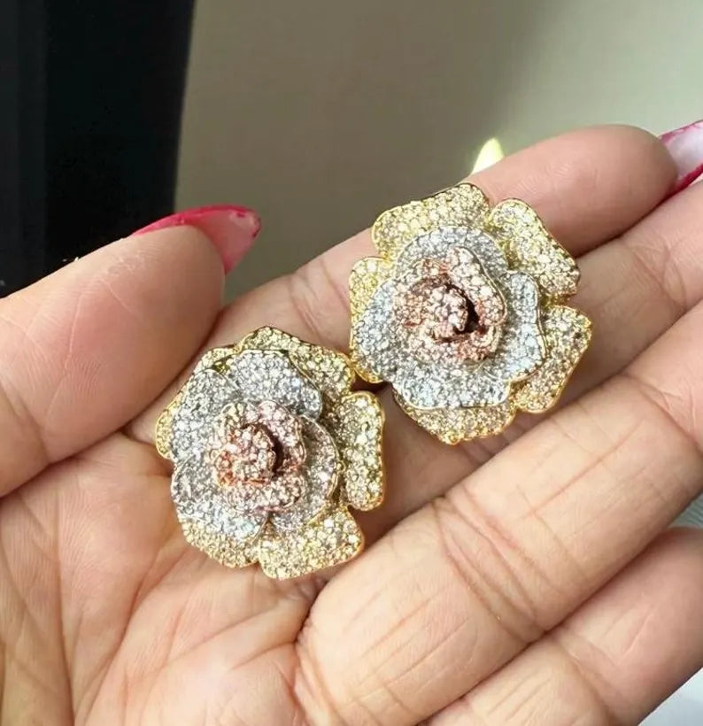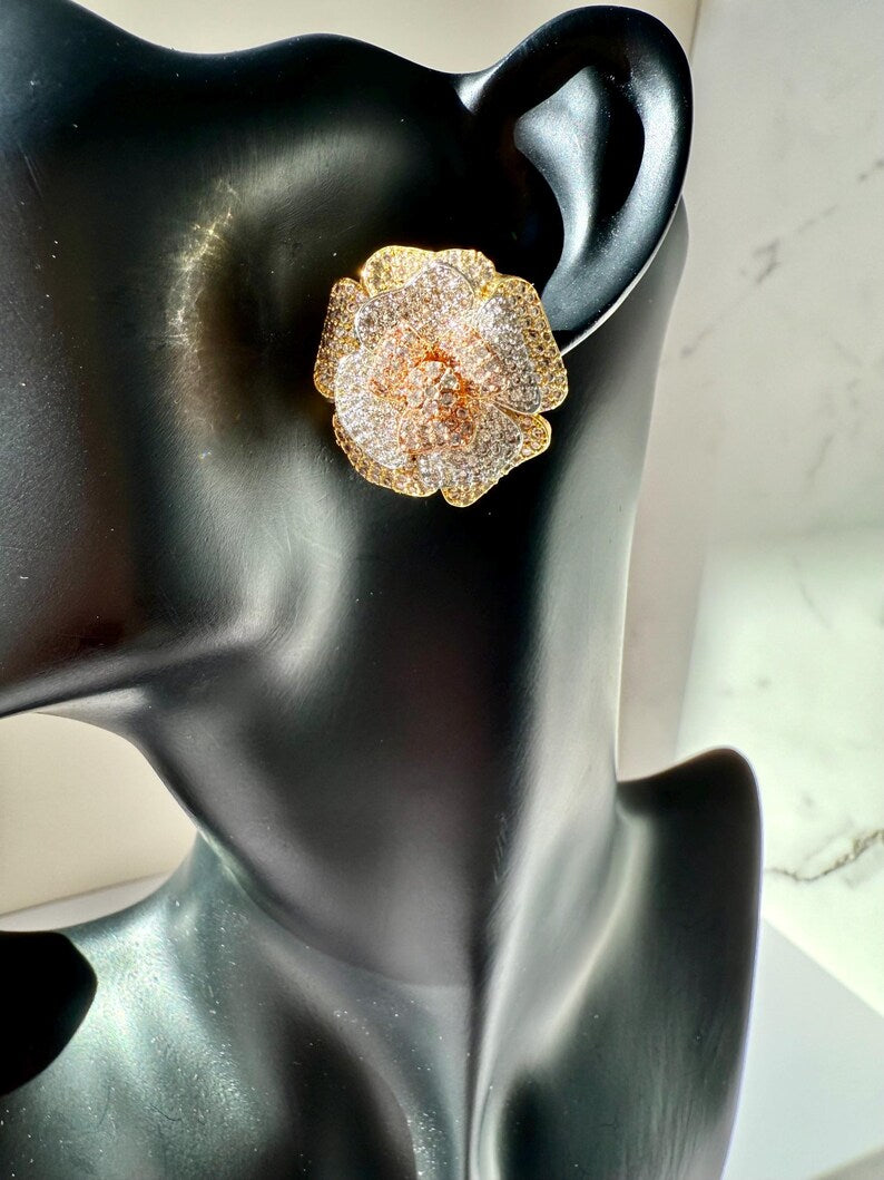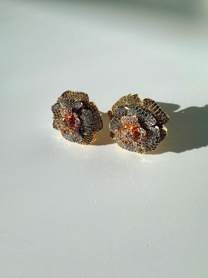 18k Gold Plated Rose Earrings, Cubic Zirconia, Multi Tone Studs
