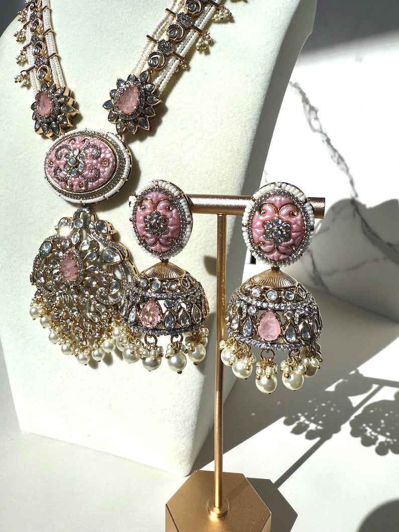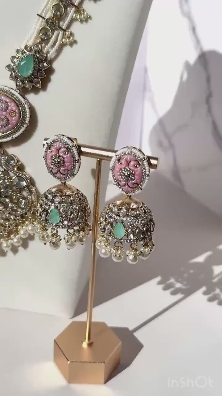 This stunning set features premium moissanite stones that shine with diamond-like brilliance, paired with traditional Pirohi handwork and enamel detailing for rich texture and depth. The layered Rani Haar drapes elegantly along the neckline, while the matching Maala and handcrafted Jhumkas complete the regal, statement look.