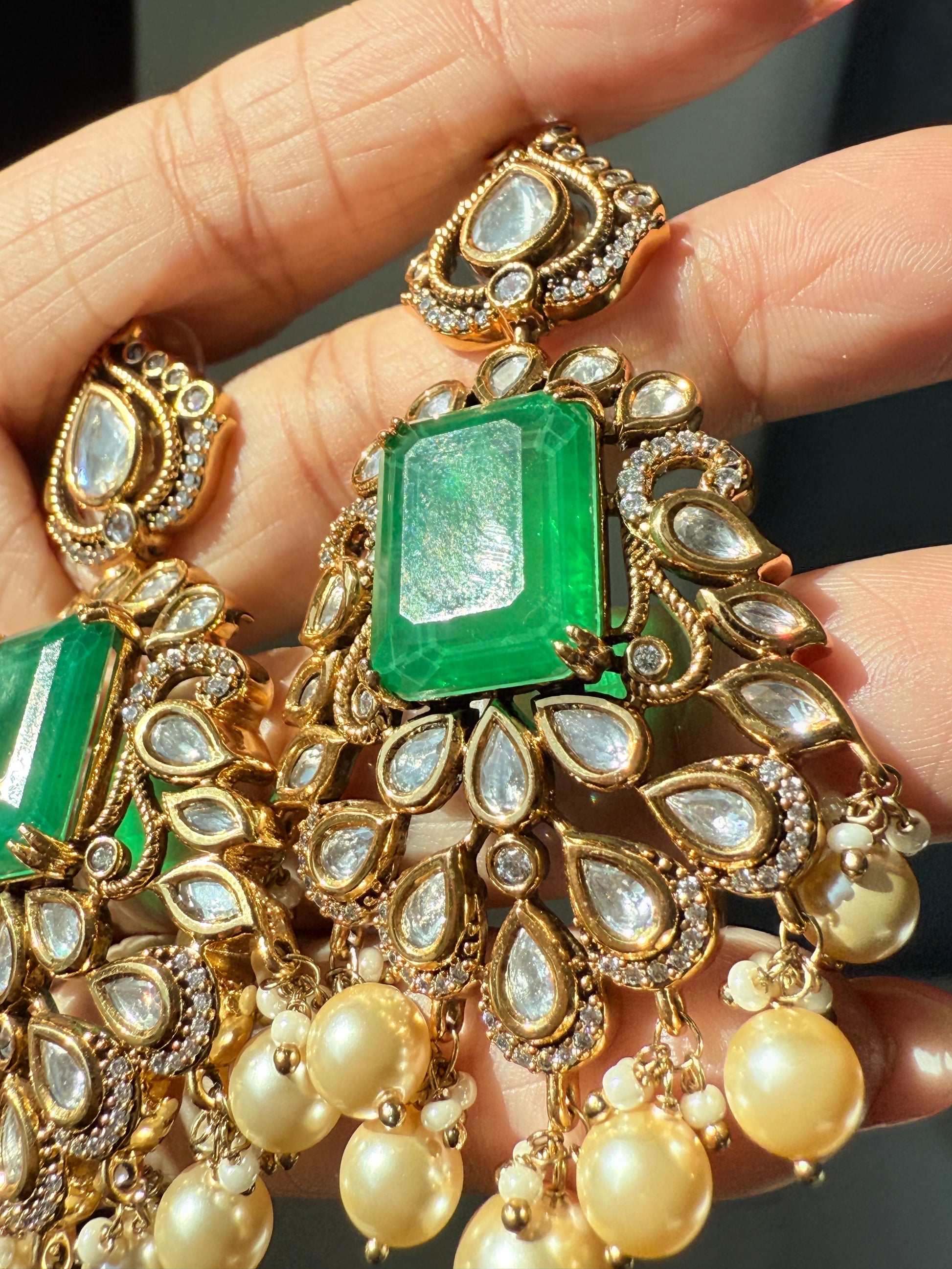 22k gold plated earrings doublet stone necklace, Indian Pakistani bridal jewelry, luxury statement earrings heritage design, South Asian jewelry USA.