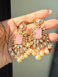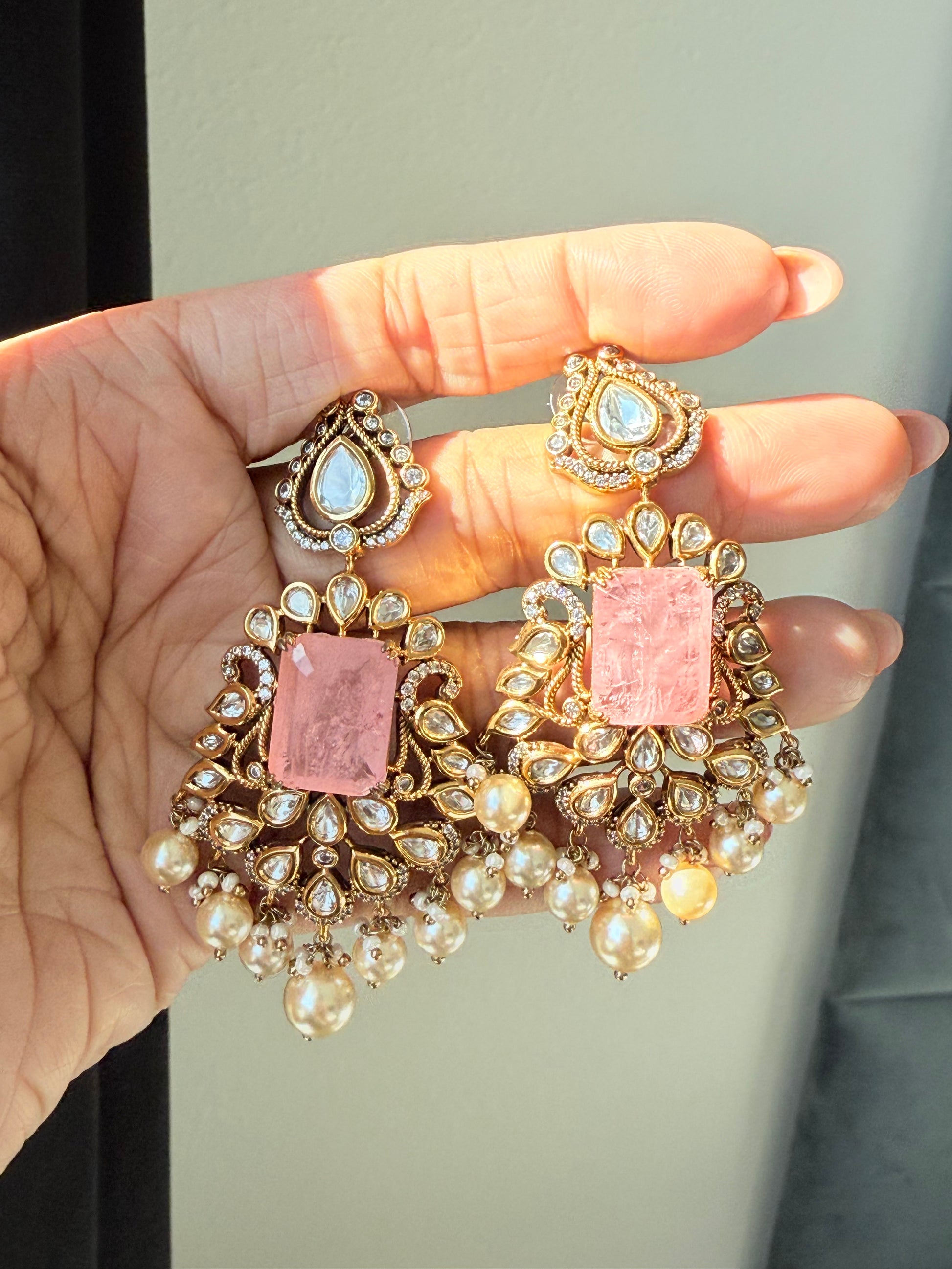22k Gold Plated Premium Moissanite & Doublet Stone Statement Earrings w Ivory Pearl Beads