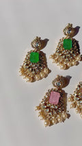 These statement earrings feature a thoughtfully balanced silhouette that combines brilliance and softness. The radiant sparkle of premium moissanite is paired with richly hued doublet stones, creating depth and visual intrigue. Delicate ivory pearl beads add a timeless charm, enhancing the earrings with a graceful, feminine finish.