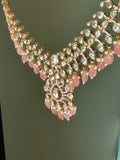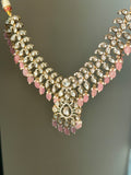 Exquisitely crafted to reflect timeless royal charm. Designed with authentic uncut Polki stones and adorned with graceful semi-precious stone beads, this luxurious set includes a beautifully coordinated necklace, matching earrings, and tikka, making it a perfect choice for brides and festive occasions.