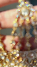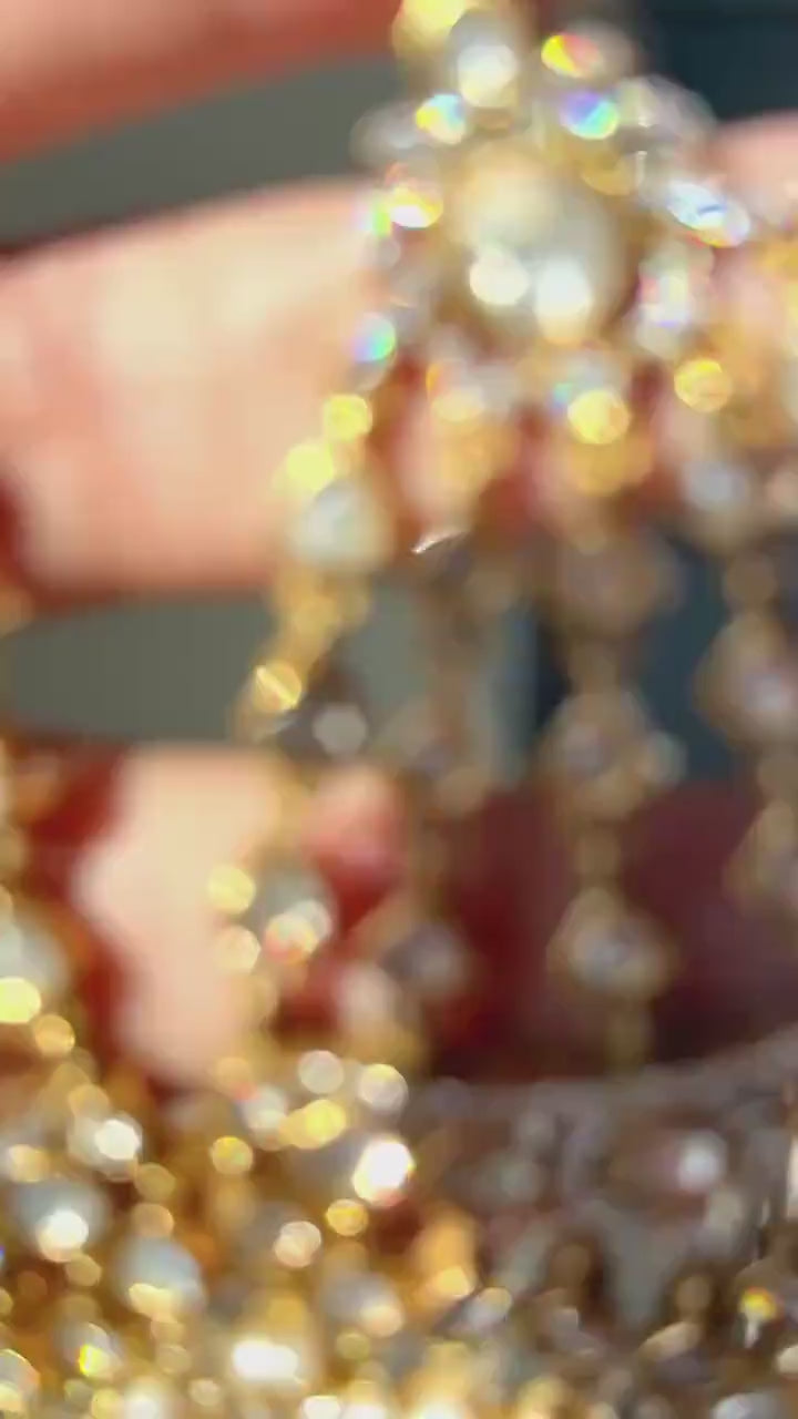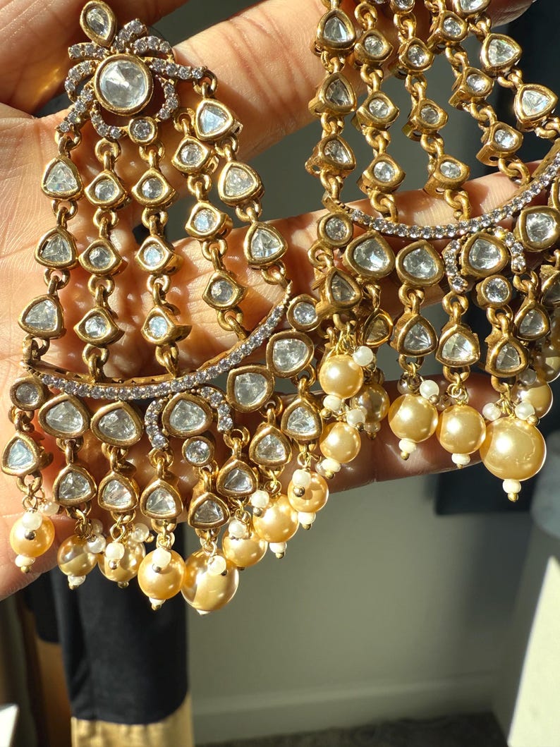 The cascading silhouette features intricately set Moissanite crystals, paired beautifully with hand-strung ivory pearl beads that add a soft, feminine touch. The combination of rich gold plating, shimmering stones, and delicate pearls creates a modern fusion of classic and contemporary style—ideal for brides, bridesmaids, or anyone who loves statement jewelry with a refined finish.