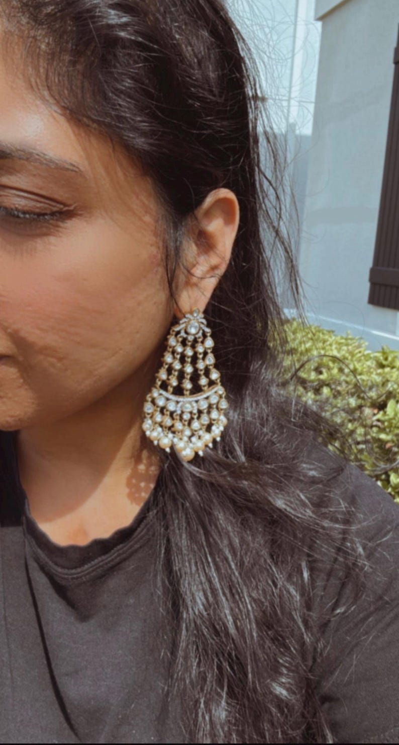 22k Gold Plated w Moissanite Stones, Lightweight Chandelier Earrings w Ivory Pearl Beads