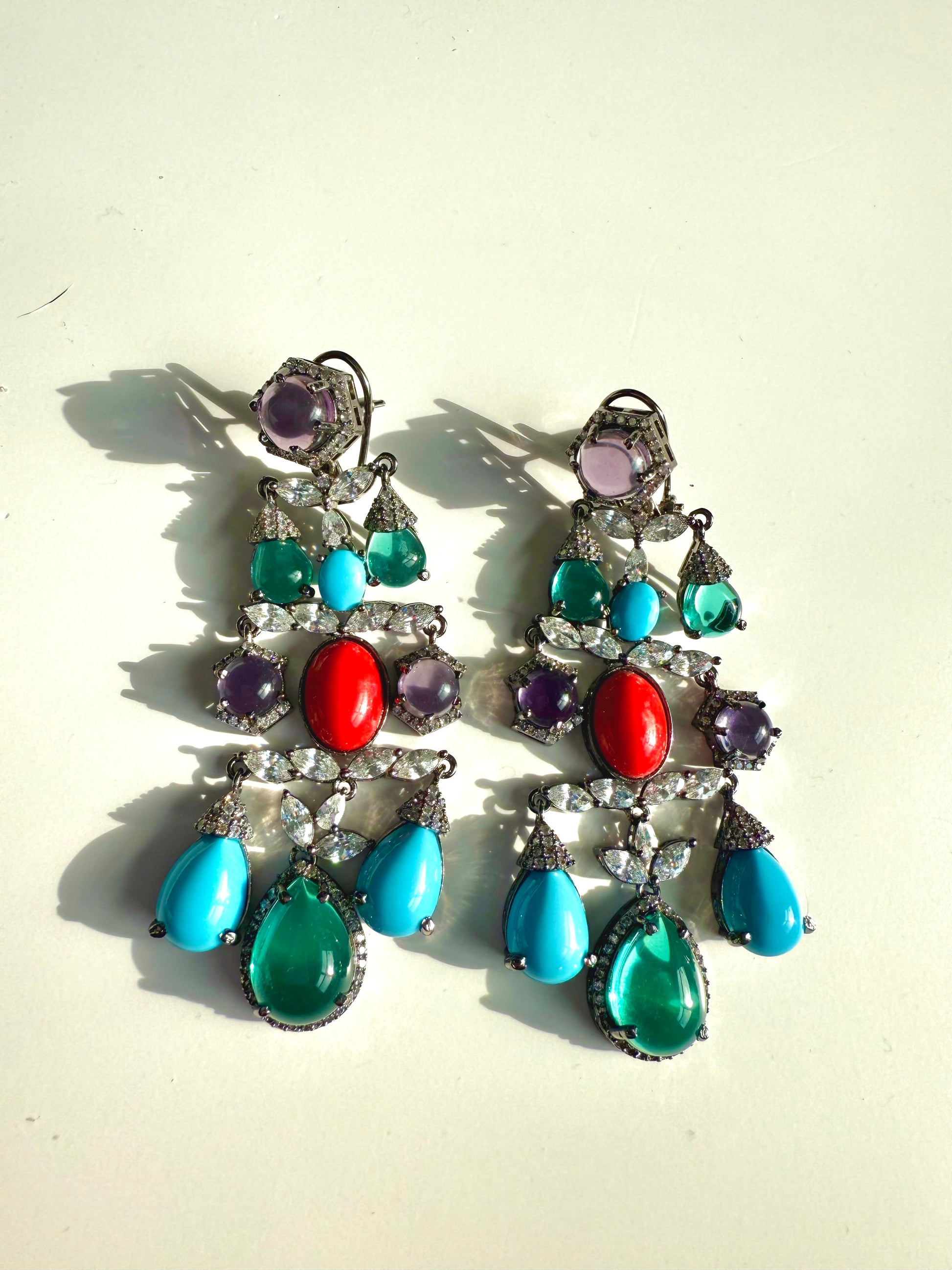 Handcrafted with precision, each earring features luminous Pota doublet stones that add depth and vibrant shine, accented with delicately placed cubic zirconia for a subtle, diamond-like sparkle. The elongated dangle silhouette flatters the face while remaining lightweight and easy to wear.