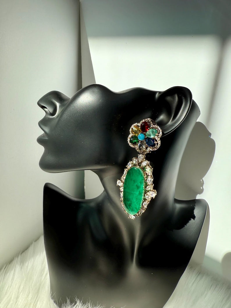 These earrings fuse modern flair with the richness of South Asian tradition. Featuring a chunky, playful design with antique gold hummingbird accents, dual-tone silver and gold details, and premium doublet stones, they celebrate heritage and artistry with a whimsical, trendy twist. Perfect for adding a statement touch to Indian, Pakistani, or Bengali wedding attire, festive occasions, and Diwali celebrations.