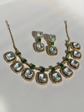 Handcrafted with authentic Polki detailing, sparkling Cubic Zirconia, and vibrant Pota Doublet Stones, this set exudes regal charm, making it perfect for weddings, festive events, and evening celebrations.