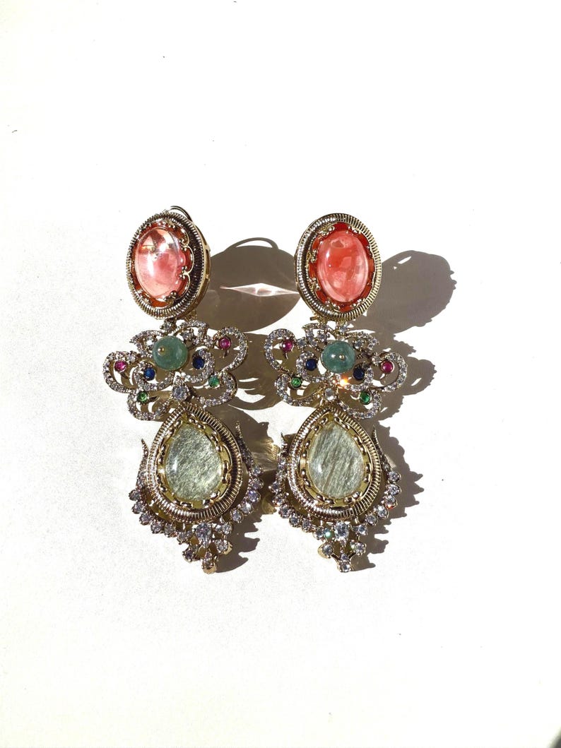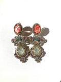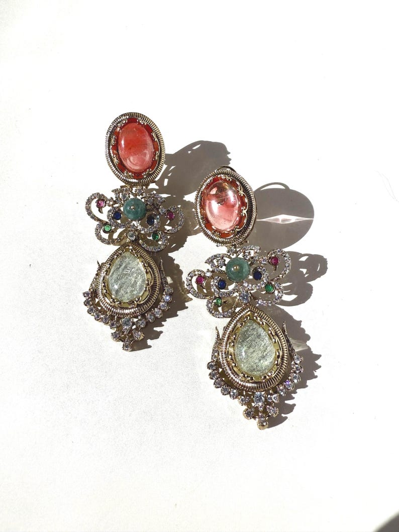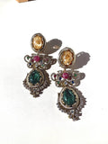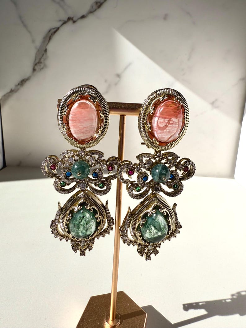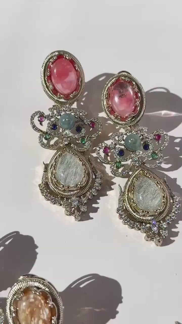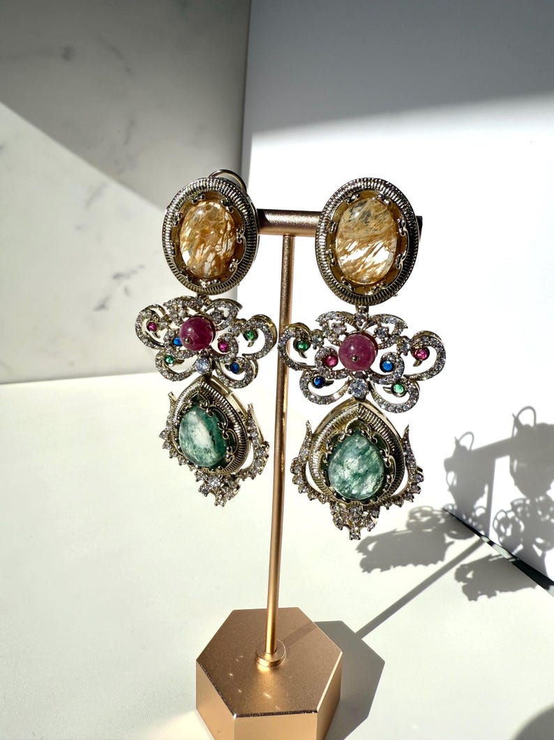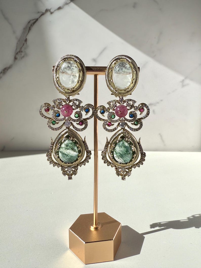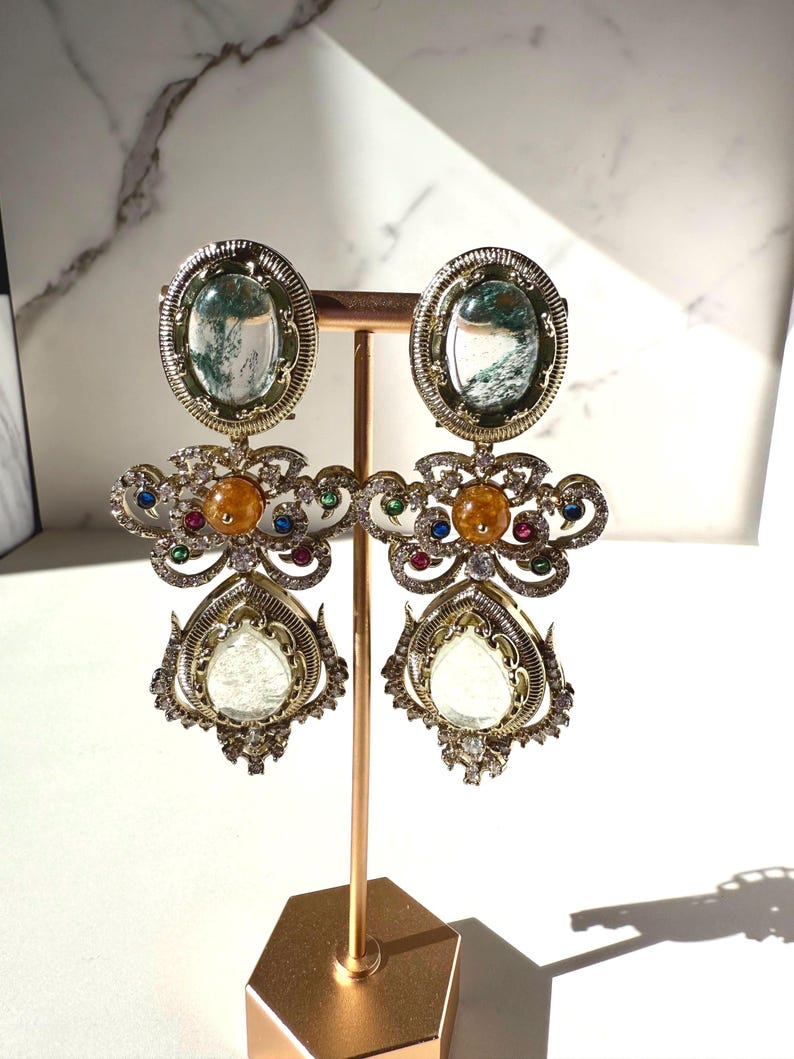 Each earring features an intricately arranged selection of high-quality semi-precious stones, chosen for their natural sheen and elegant color palette. Sparkling Cubic Zirconia accents add a touch of brilliance—reflecting light beautifully from every angle while enhancing the regal charm of the design. Finished with rich 10K gold plating, the earrings offer a warm, heirloom-inspired glow that complements both traditional and modern outfits.