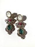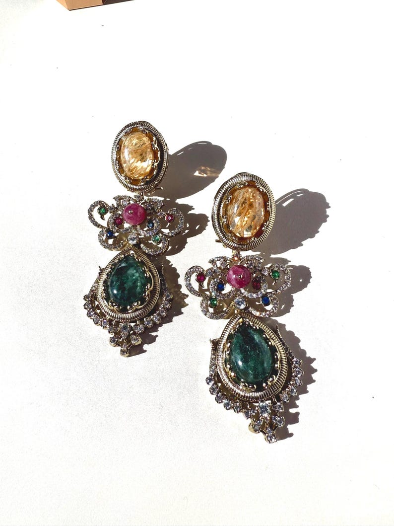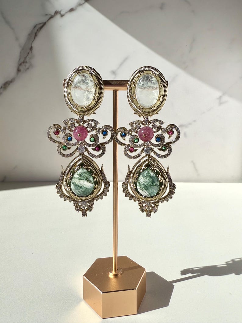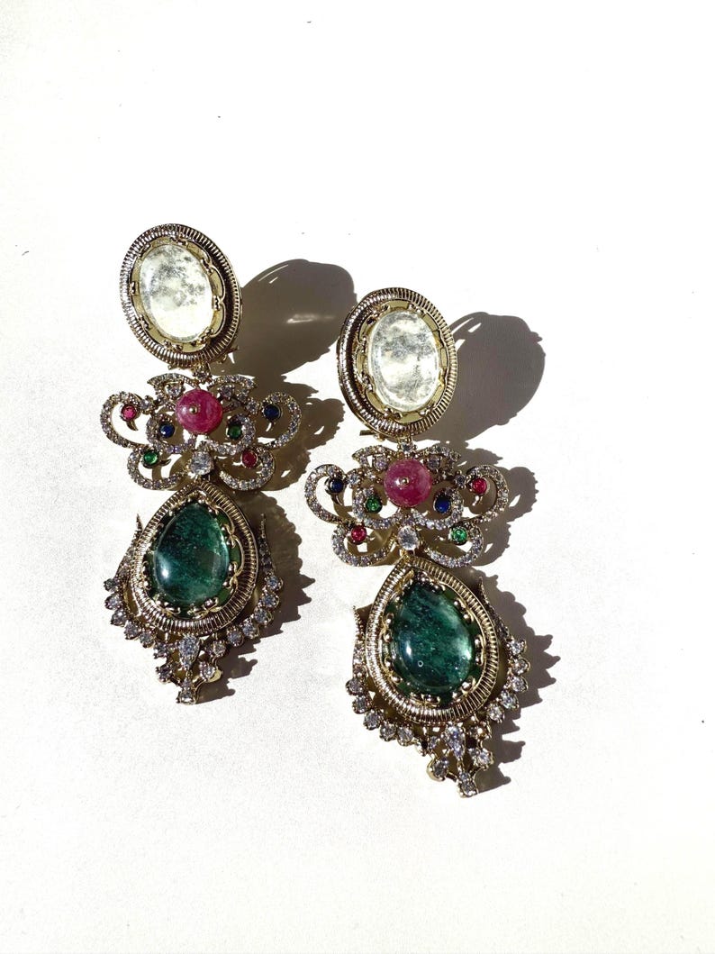 Earrings ✨ designed to capture the richness, opulence, and timeless grace of classic royal Indian jewelry. Handcrafted with meticulous attention to detail, these statement earrings combine semi-precious stones, brilliant Cubic Zirconia, and luxe 10K gold plating to create a piece that feels luxurious yet effortlessly wearable for any special occasion.