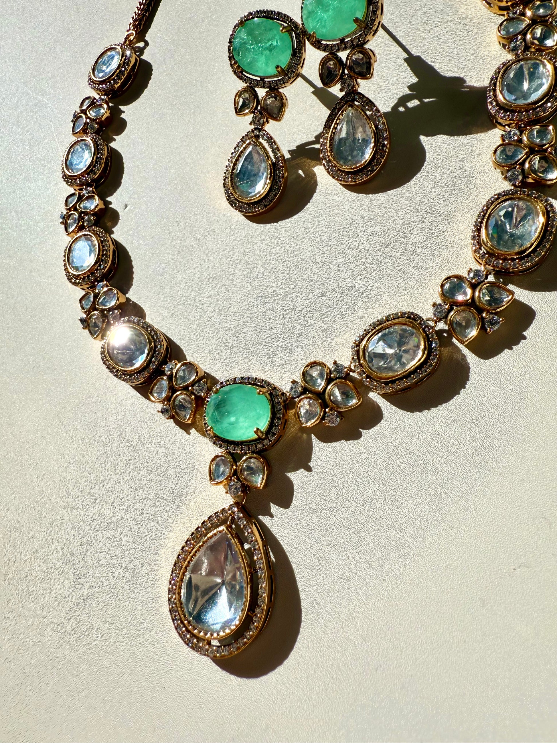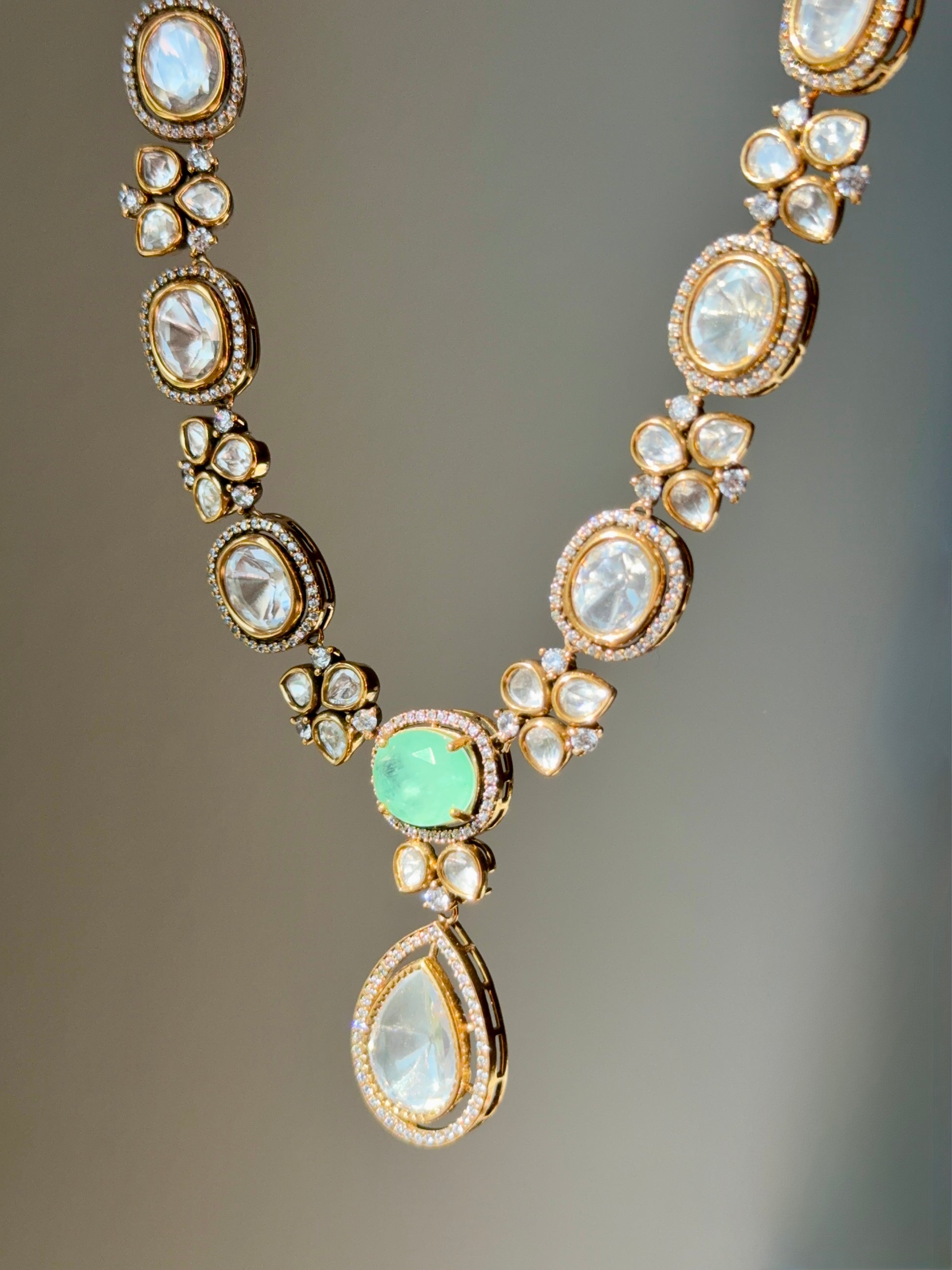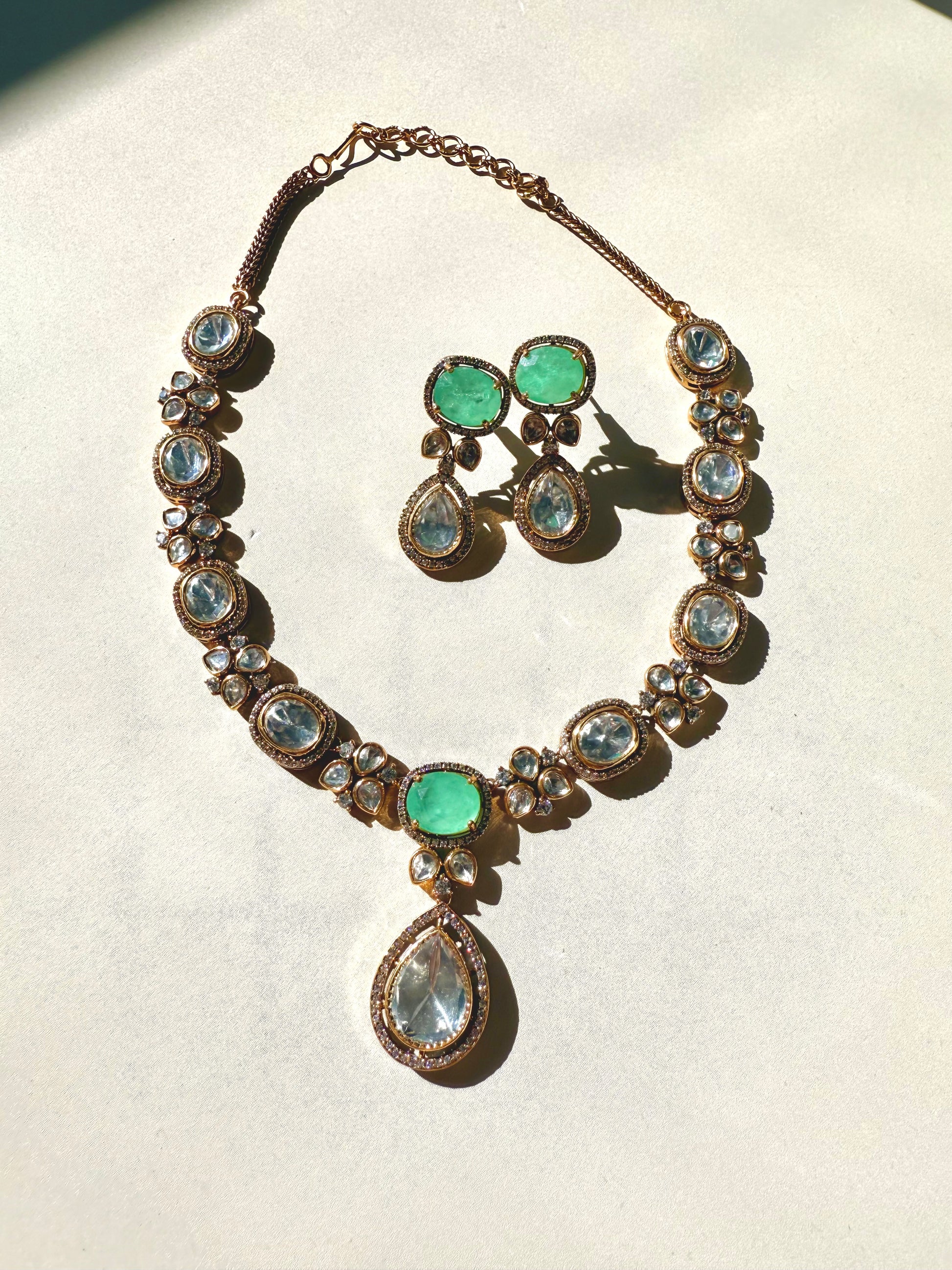 Moissanite Polki jewelry, 22k gold plated set, doublet stone necklace, Indian Pakistani bridal jewelry, luxury statement set, heritage Polki design, South Asian jewelry USA.