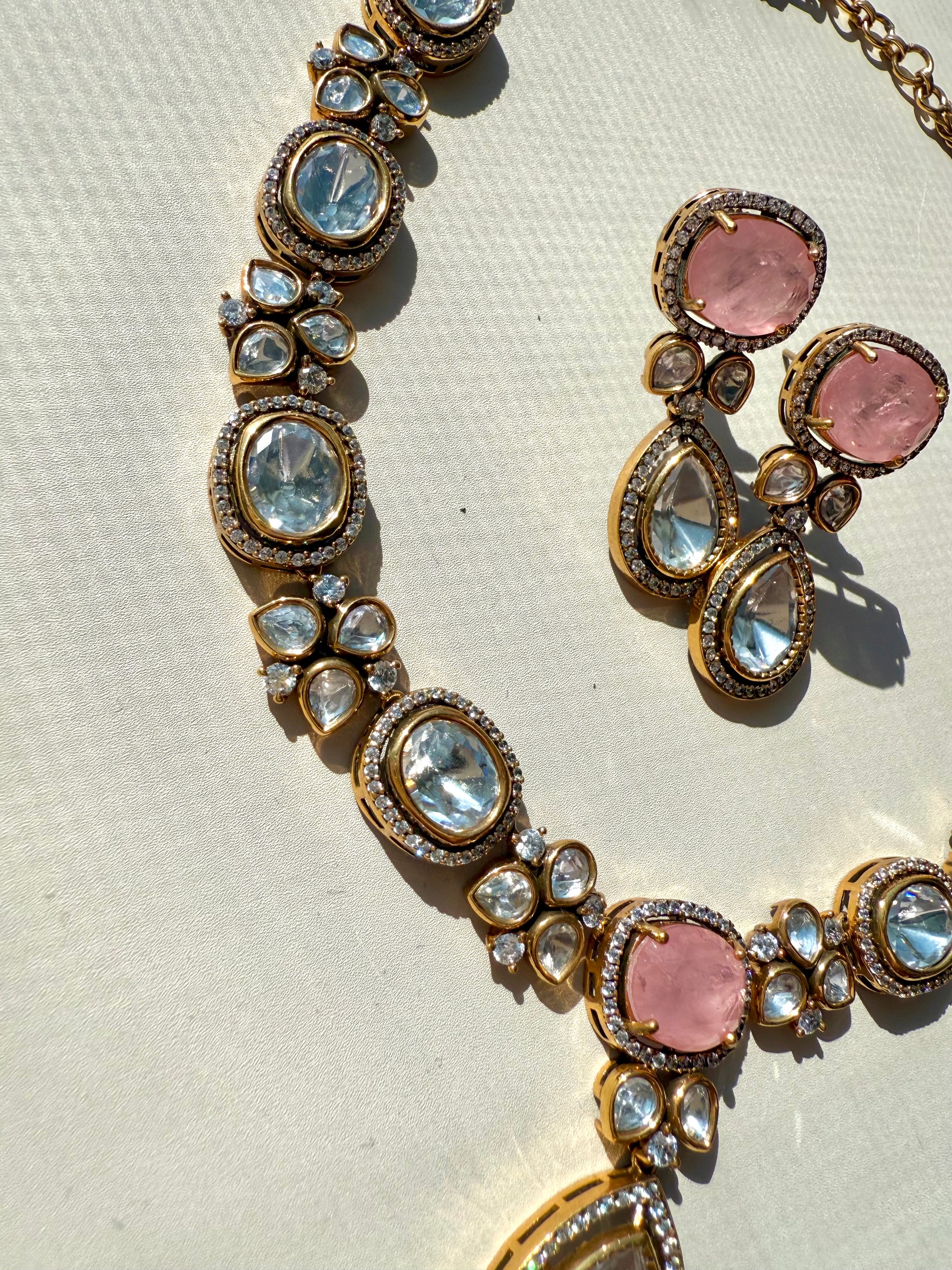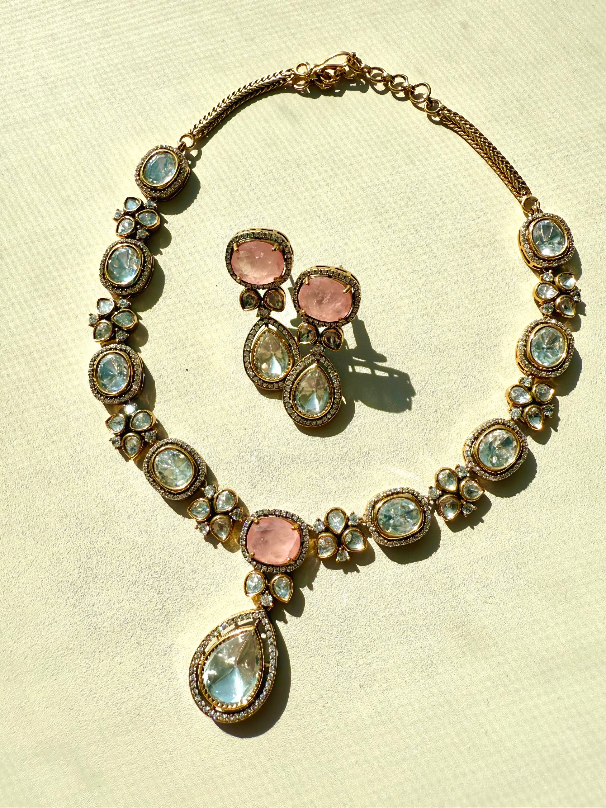 Designed to sit gracefully along the neckline, this necklace radiates elegance while the matching earrings complete the look with refined symmetry. Every detail reflects premium quality, making this set a true statement of luxury and craftsmanship.